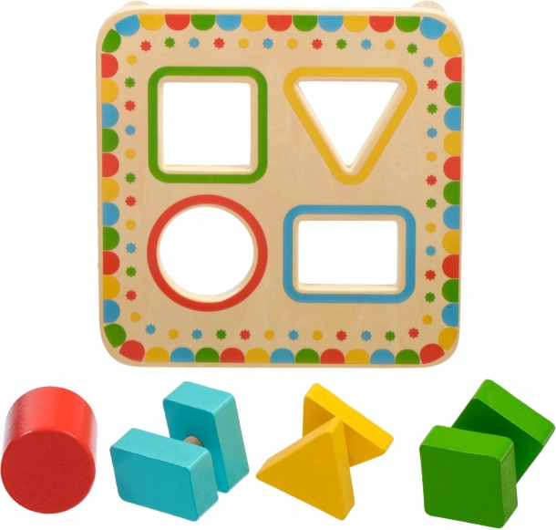 Štyri farebne orámované otvory na doske zodpovedajú farbám dielikov. Deti si ľahko osvojujú farby aj základné geometrické tvary.