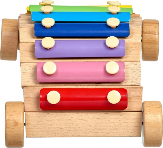 Veselý dúhový xylofón na drevenom podvozku s kolieskami rozvíja hudobný sluch, rytmus a jemnú motoriku. Farebné kovové lamely vydávajú čisté tóny, súčasťou sú 2 drevené paličky. Bezpečné prevedenie a robustné spracovanie z neho robia ideálnu edukačnú hračku pre predškolákov.