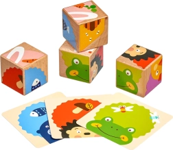 Zo štyroch drevených kociek deti poskladajú až šesť rôznych obrázkov podľa priložených predlôh. Každé otočenie prináša nový, zábavný úkol a udržiava pozornosť malých staviteľov.