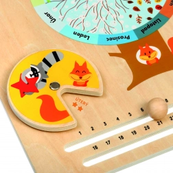 Drevený kalendár prírody LUCY & LEO je ideálna pomôcka na hravé učenie. Uprostred dosky nájdete listnatý ovocný strom s ukazovateľom 12 mesiacov, vďaka ktorému si deti ľahko spoja zimu so snehom, jar s kvetmi, leto s ovocím a jeseň s opadávajúcimi listami. Deti sa zároveň učia rozpoznávať dni v týždni, počet dní v mesiaci, počasie, teplotu a vhodné oblečenie pre rôzne podmienky.