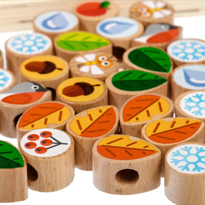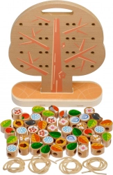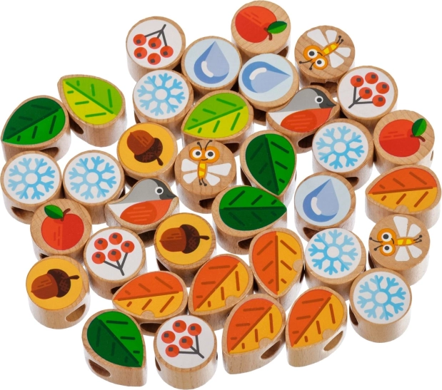 Tento kvalitný drevený set prináša deťom zábavné prevliekanie a šnurovanie na pevnej stromovej doske so stojanom. Súčasťou sú farebné dieliky (listy, kvety, bobule, žalude, ovocie, vločky, hmyz a i.) a niekoľko šnúrok pre nekonečné variácie. Dieliky možno po hre uložiť do praktického ľanového vrecúška.