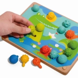 Tento herný set rozvíja jemnú motoriku a tvorivé myslenie detí vďaka 35 rôzne štruktúrovaným silikónovým kolíčkom a farebným predlohám so zvieratkami.