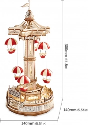 Táto prepracovaná 3D drevená skladačka je inšpirovaná klasickou padákovou vežou zo zábavného parku. Šesťuholníková základňa a bočné priesvitné okná prepúšťajú teplé svetlo, ktoré podčiarkuje jedinečnú atmosféru. Kolotoč je poháňaný batériovým motorčekom a osvetlený LED svetlami, pričom dotykové ovládanie umožňuje samostatne riadiť pohyb aj zvuk.