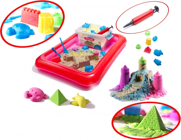 Detská piesková súprava obsahuje 14 plastových foriem, hrable, sito, špachtľu a lievik. S takýmto príslušenstvom sa rozhodne nebudete nudiť. V sade s kinetickým pieskom je tiež nafukovacie pieskovisko, ktoré vám umožní udržiavať poriadok na mieste hry.