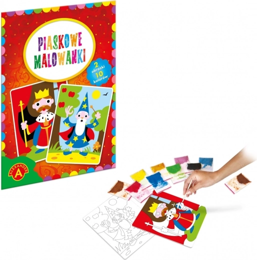 Kreatívna sada Pieskové maľovanie – kráľ a čarodej od značky Alexander umožňuje deťom vytvárať farebné obrázky pomocou farebného piesku. Stačí postupne odkrývať samolepiace plochy a posypať ich pieskom podľa predlohy alebo fantázie. Aktivita rozvíja jemnú motoriku, koordináciu oko–ruka, trpezlivosť a kreativitu, zároveň prináša relaxačný zážitok a posilňuje sebadôveru.