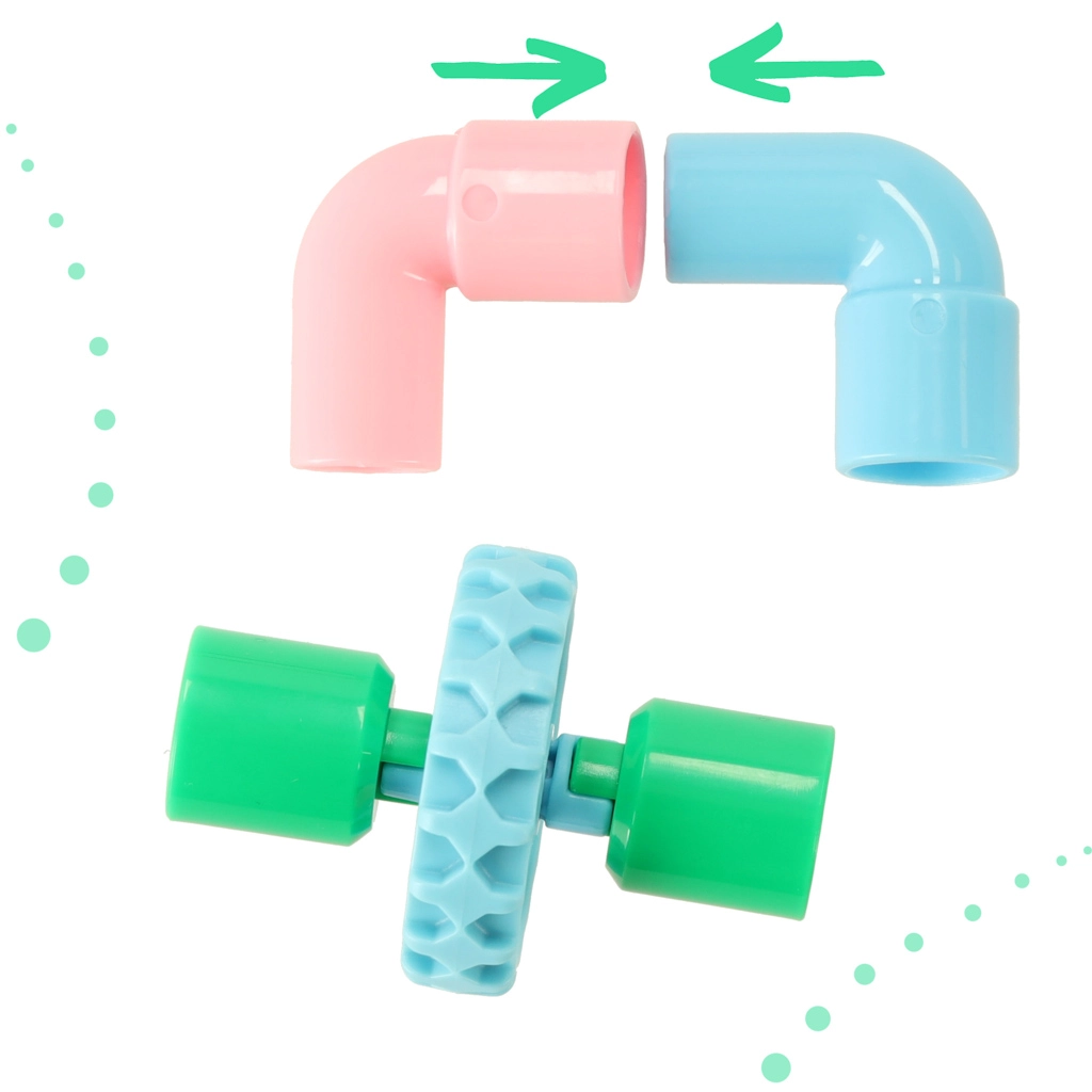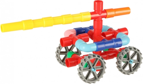 Farebný a zábavný svet tvorby. Doprajte svojmu dieťaťu nekonečné možnosti tvorby s týmto súborom stavebných kociek pripomínajúcich vodné rúrky. Ideálne pre hranie doma alebo vonku, prínosom pre rozvoj kreativity a motorických schopností. Súprava obsahuje 84 dielikov vrátane kolies, ktoré umožňujú stavbu vozidiel. Rúrky sú vodoodolné, čo znamená, že sa dajú použiť aj vo vode.