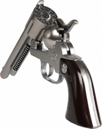 Štýlový kovbojský revolver v klasickom dizajne poteší malých pištoľníkov aj milovníkov westernovej atmosféry. Kovové telo dodáva hračke odolnosť a príjemnú hmotnosť v ruke, zatiaľ čo výrazná špička jasne ukazuje, že ide o bezpečnú hračku. Vďaka bubienku na 12 rán je hra plynulá a zábavná.