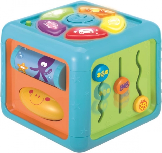 Pri pohybe kocky sa aktivujú zábavné zvukové efekty, ktoré motivujú dieťa k objavovaniu. Otočný valec s morskými motívmi pridáva ďalšie senzorické podnety, zatiaľ čo bezpečné a odolné plasty zabezpečujú spoľahlivosť a dlhú životnosť hračky.