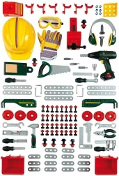 - Realistická výbava: akumulátorový skrutkovač, píla, kladivo, kľúče, kliešte, pilník, zverák, skrutky a matice.
