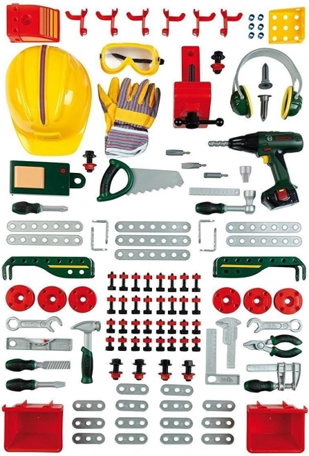 Kompletný detský pracovný ponk BOSCH so 150 dielmi prináša realistické náradie a príslušenstvo pre malých majstrov. Obsahuje akumulátorový skrutkovač, pílu, kladivo, kľúče, kliešte, skrutky a matice aj pevný stojan s dierovanou stenou na prehľadné uloženie. Kvalitný plast zaisťuje odolnosť a hra podporuje kreativitu a jemnú motoriku na dlhé hodiny zábavy.