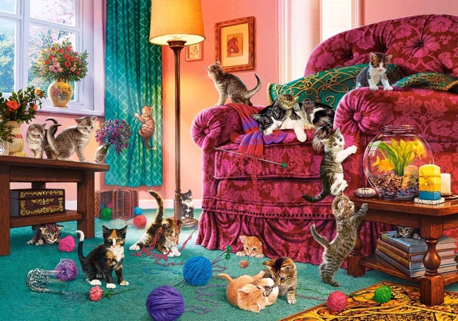 Puzzle zobrazujú útulnú obývačku plnú hravých mačiatok a farebných klbiek vlny.