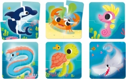 Táto sada obsahuje 6 ilustrovaných kartičiek s morskými zvieratami, z ktorých každá sa skladá zo 4 veľkých dielikov. Vďaka sýtym farbám a jednoduchým tvarom sa deti ľahko zorientujú a rýchlo pochopia princíp skladania. Veľkosť dielikov je prispôsobená malým ručičkám a podporuje koordináciu oko–ruka.