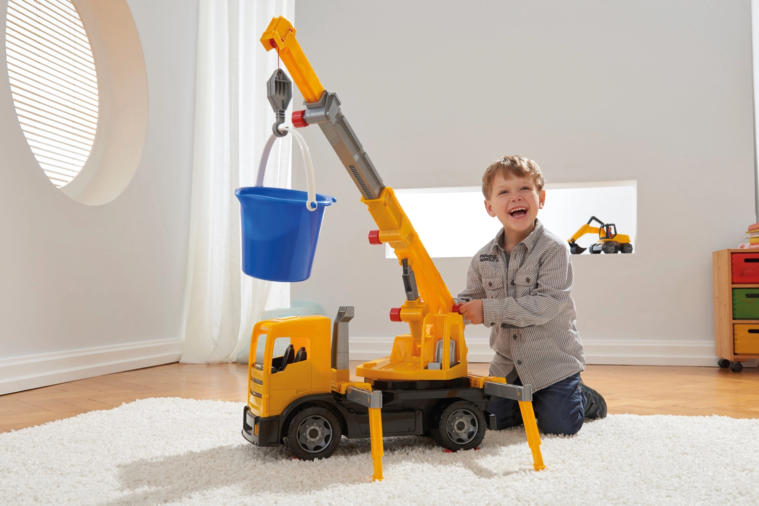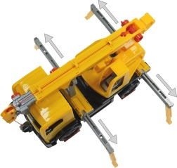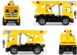 Robustný plastový autožeriav pre malých staviteľov ponúka realistické funkcie a veľkú dávku zábavy. Má dĺžku 70 cm a po vysunutí dosahuje až 115 cm. Vďaka 4 výsuvným stabilizačným nohám, otáčaniu ramena o 270°, funkčnému navijaku s hákom a mechanickému ovládaniu ramena si deti užijú autentickú stavebnú hru a rozvoj jemnej motoriky.