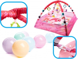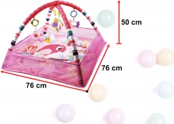 Podložka je pevná a odolná, navrhnutá tak, aby vydržala dlhodobé používanie. Zavesené hračky a pastelové loptičky prispievajú k rozvoju zmyslov.