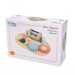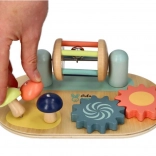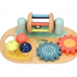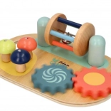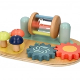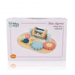 Drevená senzorická aktívna doska od značky Adam Toys ponúka farebnú senzorickú stimuláciu a rozvoj jemnej motoriky pre najmenšie deti vďaka rotujúcim ozubeným kolieskam a hríbikom na hranie.