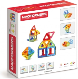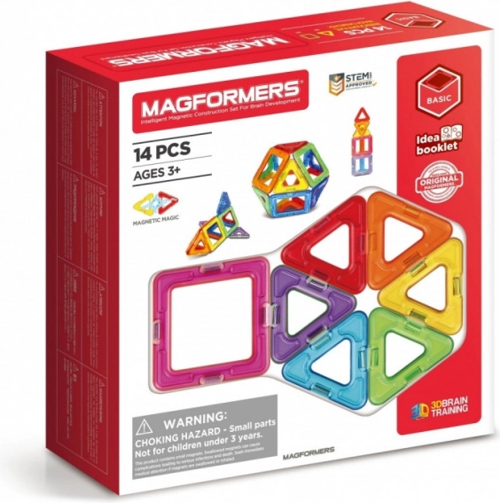 MAGFORMERS BASIC 14 sú bloky so zabudovanými silnými neodýmovými magnetmi, ktoré sa vždy navzájom priťahujú. Stačí priblížiť steny dvoch blokov k sebe a tie sa okamžite prepoja. Z kociek vytvorených podľa geometrických tvarov môžete stavať nádherné trojrozmerné stavby. Pri hre môžete použiť priložený návod alebo iné príklady na stránkach magformersworld.com, prípadne vlastnú fantáziu. Sada obsahuje: 8 trojuholníkov; 6 štvorcov.