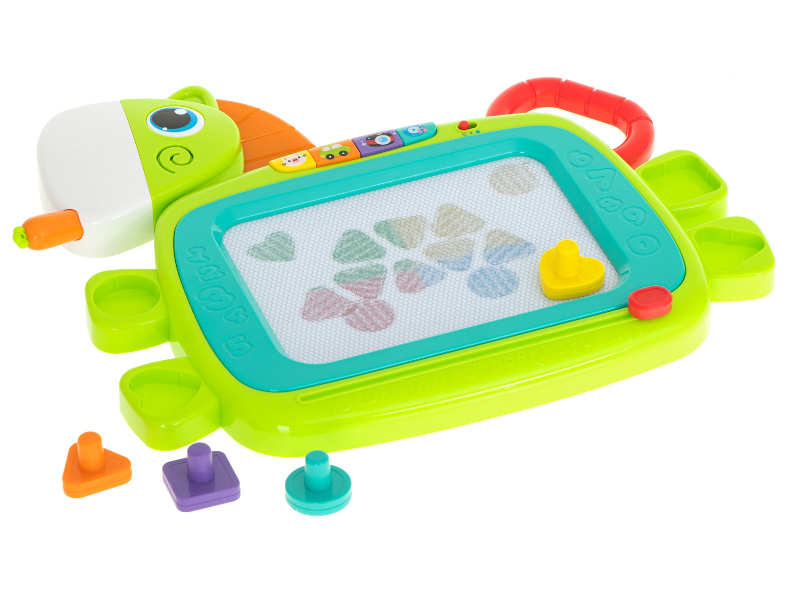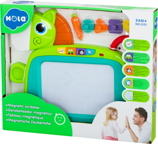Magnetická tabuľka HOLA je skvelá voľba na rozvoj kreativity a jemnej motoriky. Vďaka štyrom farebným zónam vznikajú obrázky v farbách, ktoré deti bavia. Jediným ťahom posuvníka plochu vymažete a je pripravená na ďalšie nápady. Tvar koníka so svietiacou hrivou a veselé zvuky motivujú deti k hre.