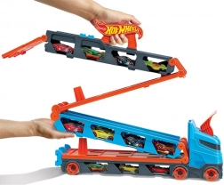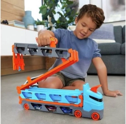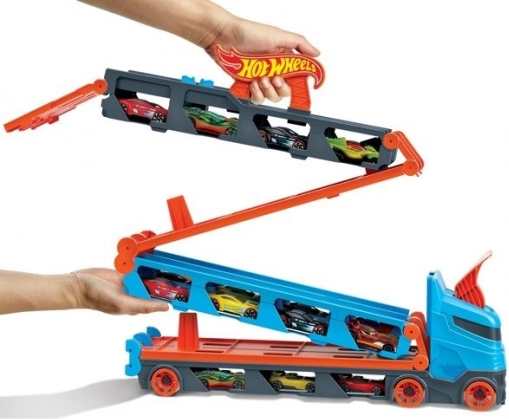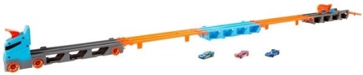 Premeň kamión behom chvíľky na plnohodnotnú závodnú trať. Transportér ukrýva až 20 autíčok za priehľadnými okienkami, takže máš zbierku stále na očiach. Po zatiahnutí za rukoväť sa náves rozloží do dvojprúdovej trate dlhej 1,8 m, zatiaľ čo kabína sa zmení na dvojitú vystreľovaciu stanicu pre férové štarty.