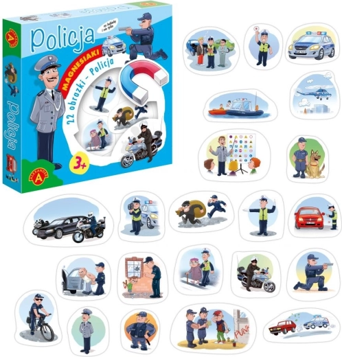 Objavte zábavnú a vzdelávaciu sadu magnetických obrázkov s policajnou tematikou od značky ALEXANDER. Balenie obsahuje 21 farebných magnetov, ktoré možno ľahko pripevniť na chladničku a iné kovové povrchy, rovnako ako používať na stole či podlahe. Vďaka veľkým rozmerom, pevnej kartónovej konštrukcii a ľahko umývateľnému povrchu sú ideálne pre malé detské ruky a každodenné hranie.