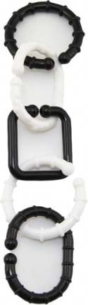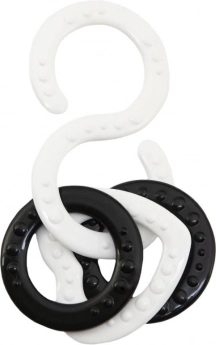 Prepojiteľné silikónové očká s reliéfom masírujú ďasná, podporujú hmat a umožnia ľahké uchopenie. S-háčiky pripevnia hračky ku kočíku alebo autosedačke.