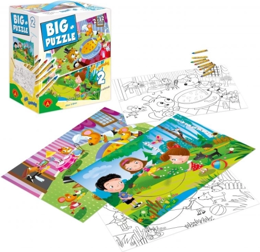 Objavte kreatívnu sadu dvoch obojstranných puzzle ALEXANDER, ktorá spája zábavu so vzdelávaním. Každé puzzle má veľké dieliky pre malé ruky (12 ks), rozmer 67 × 47 cm a z jednej strany ponúka farebný motív, z druhej zas čiernobiely obrázok na vyfarbovanie. Súčasťou je aj sada pasteliek, takže deti môžu začať tvoriť ihneď. Skvelé na rozvoj motoriky, logického myslenia a kreativity detí od 3 rokov.
