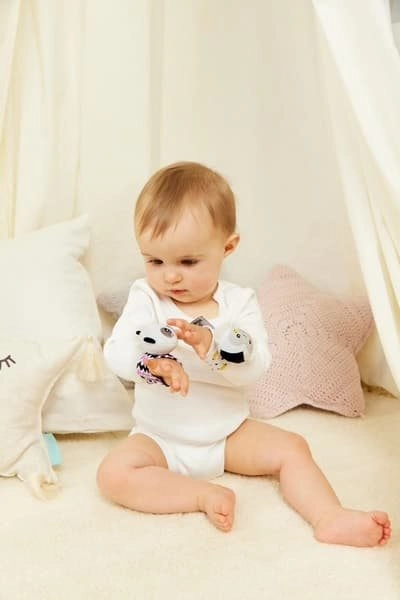 Mäkučké detské hrkálky na zápästie od GAGAGU rozvíjajú sluch, zrak aj jemnú motoriku. Vďaka kontrastným farbám a jemnému zvuku hrkálok zaujmú bábätko, zatiaľ čo príjemný plyšový materiál bez plastových dielov je bezpečný a vhodný aj pre najmenších. Možno ich pripevniť na ruku suchým zipsom alebo používať ako klasickú hrkálku.