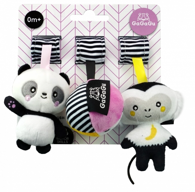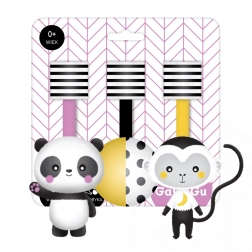 Závesné zvieratká môžu deti pozorovať ležiace na chrbte alebo preskúmať priamo v rukách. Plyšové kontrastné hračky sú odnímateľné, a preto ich možno samostatne pripevniť ku kočíku alebo k iným výrobkom z tejto kolekcie.
