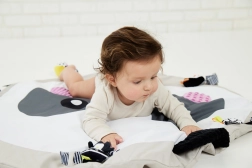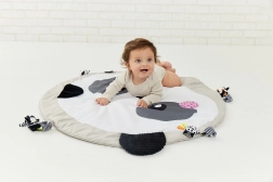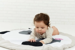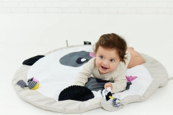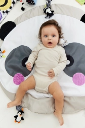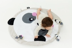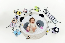 Objavte mäkkú a bezpečnú zmyslovú podložku pre bábätká s motívom pandy od GAGAGU. Kontrastné čierno-biele vzory podporujú zrakový vývoj, rôzne textúry na uškách a líčkach rozvíjajú hmat a všitý šuštivý materiál stimuluje sluch. Podložka je bez plastových dielov, príjemne mäkká a hustá pre tepelný komfort, s praktickými pútkami na pripevnenie ďalších hračiek.