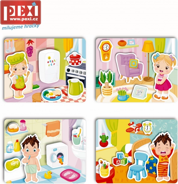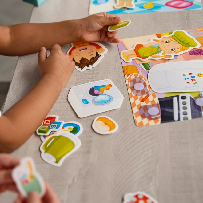 Objavte zábavnú vzdelávaciu hru pre najmenších, ktorá rozvíja koordináciu ruka–oko, jemnú motoriku, reč a vyjadrovanie aj pozornosť. Deti priraďujú predmety do správnych miestností pomocou suchého zipsu, takže dieliky dobre držia a hra je intuitívna aj pre malé ruky.