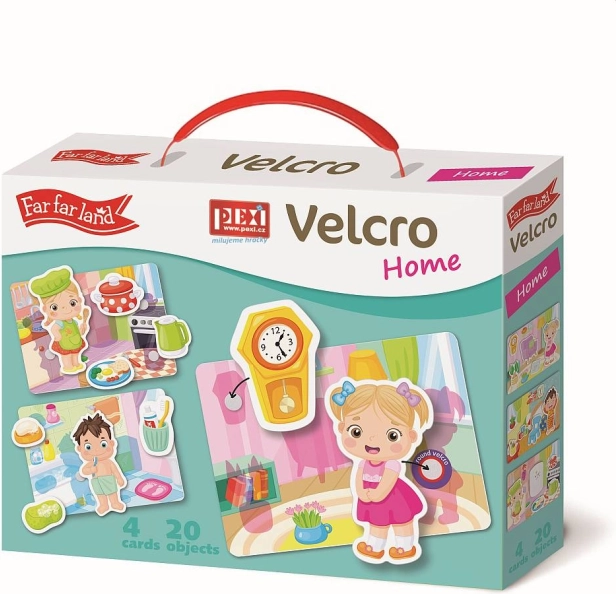 Velcro skladačky Domov zábavnou formou zoznamujú deti s predmetmi každodenného života a ich správnym umiestnením v domácnosti. Vďaka pružným plastovým doštičkám a dielikom so suchým zipsom je manipulácia jednoduchá a bezpečná. Špeciálna povrchová úprava je príjemná na dotyk a podporuje samostatnú hru.
