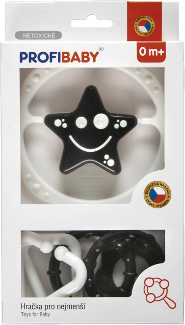 Praktická čiernobiela súprava hrkálok pre bábätká kombinuje reťaz na kočík a samostatnú hrkálku v tvare hviezdičky alebo kvietka. Kontrastné farby podporujú vizuálne vnímanie, zatiaľ čo jemný zvuk a bezpečné tvary rozvíjajú motoriku a zmysly dieťaťa. Hrkálky sú navrhnuté na pohodlné uchopenie a spĺňajú prísne hygienické normy. Bez ostrých hrán, bez malých uvoľniteľných častí a ideálne na každodenné hranie doma aj na cestách.