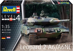 Realistický plastový model LEOPARD 2A6/A6NL pre skúsených aj začínajúcich modelárov. Nemecký hlavný bojový tank 3. generácie v detailnom prevedení od Revell. Sada neobsahuje farby ani lepidlo; odporúčané odtiene sú uvedené nižšie pre dosiahnutie autentického vzhľadu.
