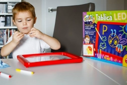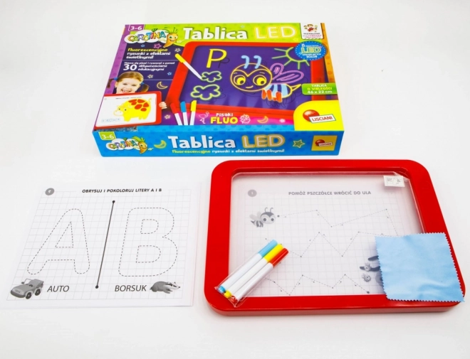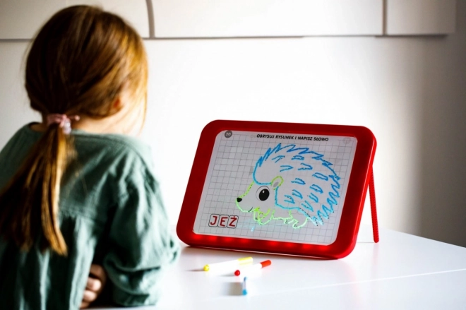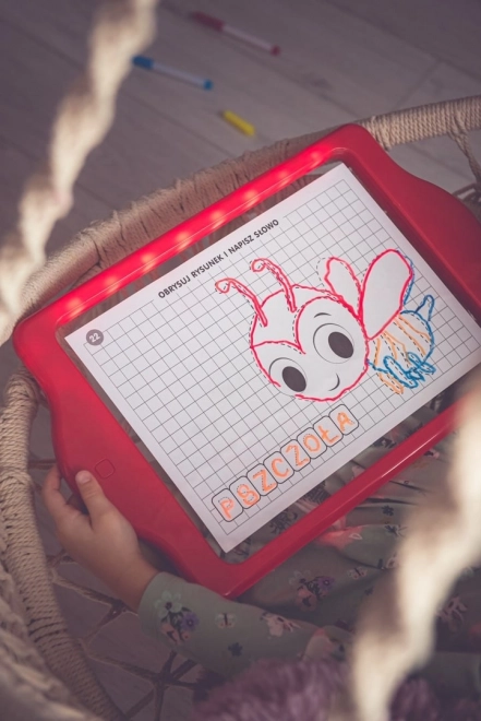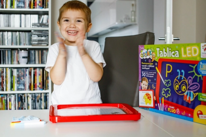 Tabuľa LED Carotina je ideálnym vzdelávacím nástrojom pre deti. Ponúka vzdelávací program založený na 30 výukových kartách, ktoré možno využiť prostredníctvom programovanej metódy kopírovania. Stačí umiestniť kartu na papierový podklad a vložiť pod transparentnú obrazovku tabule. Kreslenie sa vykonáva pomocou troch fluorescenčných fixov, ktoré sú súčasťou sady. Vďaka týmto fixom môžu deti kresliť opakovane a mazať kresby pomocou suchej utierky. Tabuľa LED je všestranná ako klasická tabuľa a svieti takmer ako neónový nápis!