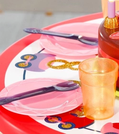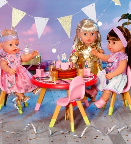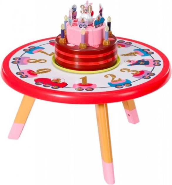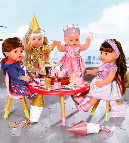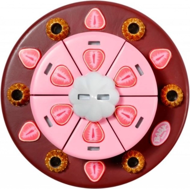 Tortová doska má dve poschodia a je rozdelená na 6 častí, z ktorých každá môže byť ozdobená číslami a obrázkami. Keď Baby Born sfúkne sviečky, torta zahrá narodeninovú melódiu.