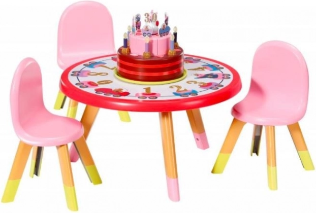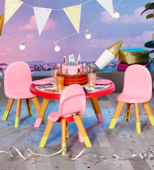 Tri stoličky a stôl v škandinávskom štýle vyzerajú, akoby boli vyrobené z dreva. Stôl je ozdobený narodeninovými dekoráciami. V strede má otočný podnos na tortu. Okrem toho sa na nábytok dajú nalepiť nálepky.