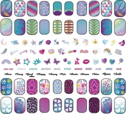 Farebné laky, umelé nechty a tematické samolepky pre kreatívny mix motívov od hviezdičiek po pruhy a prechody.