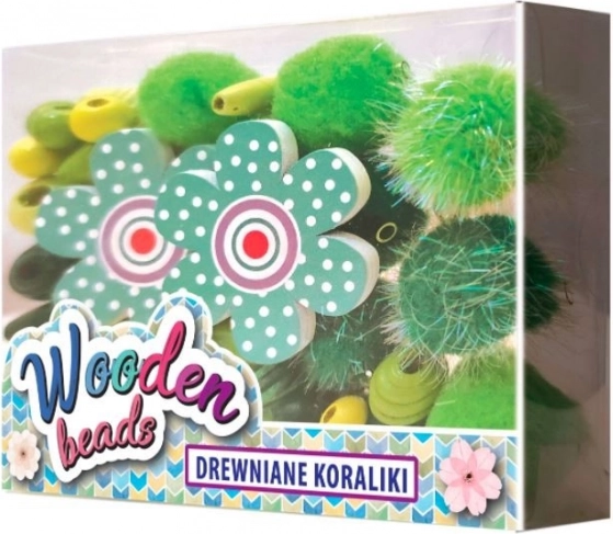 Kreatívna sada pre deti: zelené drevené koráliky, pompony, kvetinové prívesky a 1 m voskovanej šnúrky. Ideálne na náramky a náhrdelníky. Vek 4+.