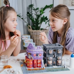 Stavajte krok za krokom: lepte tehlu k tehle, režte a prispôsobujte dosky, potom pridajte tematické doplnky pre autentickú atmosféru Šikmej uličky. Vďaka vodou rozpustnému lepidlu je model opakovane použiteľný – jednoducho namočte, rozložte a stavajte znova. Sadu môžete kombinovať s ďalšími setmi BRICK TRICK HARRY POTTER a vytvoriť rozsiahly svet čiar a kúziel vrátane hradu Rokfort.