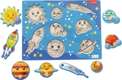 Drevená vkladačka s vesmírnymi motívmi je skvelou voľbou pre prvé logické hry. Vďaka dreveným knobom sa diely ľahko držia aj malými rúčkami a deti si pri hre trénujú presnosť a trpezlivosť. Čiernobiela grafika v prehĺbeninách kopíruje obrázok na dielikoch a uľahčuje správne umiestnenie.