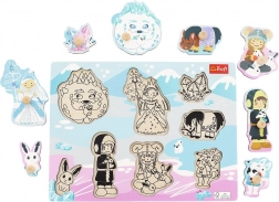 Drevená skladačka s motívom Ľadového zámku je navrhnutá na prvé objavovanie tvarov. Každý z 8 pevných dielikov má drevenú úchytku na jednoduché uchopenie a presné vloženie. Podkladová doska s vyhĺbenými tvarmi a čiernobielou grafikou totožnou s dielikom deťom uľahčuje orientáciu a podporuje samostatné riešenie.