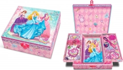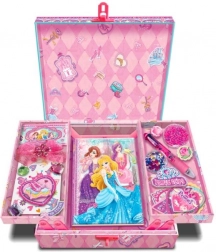 Objavte čarovný darčekový set v dekoratívnej krabičke s motívom Princess. Dve bočné poličky sa ľahko vyklápajú a pod nimi sa skrýva denníček na tajné priania a zážitky. Perfektný na ukladanie drobností aj každodenné písanie.
