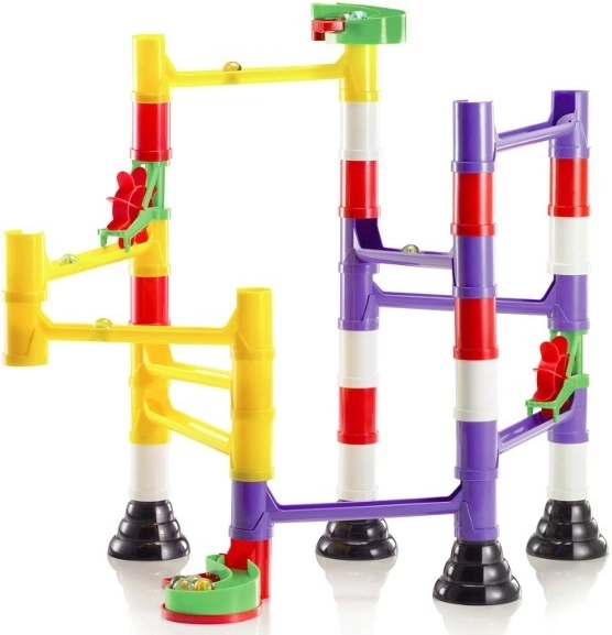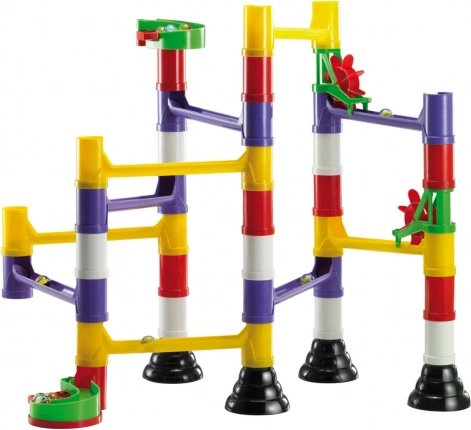Modulárne trubice, stĺpiky a koľajnice do seba presne zapadajú. Deti rýchlo pochopia logiku stavby a môžu neustále meniť trasu guľôčok.