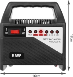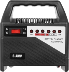 Kompaktná automatická nabíjačka pre batérie 6 V aj 12 V s nabíjacím prúdom až 6 A. Ideálna pre autobatérie, motobatérie a olovené akumulátory 20–65 Ah. Ponúka prepínač napätia, LED indikáciu úrovne nabitia a nízku hmotnosť pre jednoduché prenášanie.