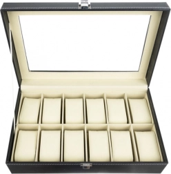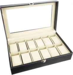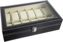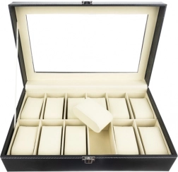 Elegantný organizér na hodinky a šperky s 12 priehradkami bezpečne uloží a krásne vystaví vašu kolekciu. Má priehľadné veko, čierny povrch s kontrastným prešívaním a mäkké polstrovanie. Magnetické zatváranie udrží obsah v bezpečí, vyberateľné vankúšiky chránia pred poškriabaním a umožnia ukladať aj náramky, náhrdelníky či prstene. Skvelý darček pre ženy aj mužov a štýlový doplnok do každého interiéru.
