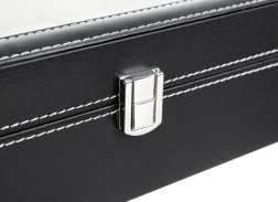 Sklenené veko umožní rýchly prehľad a štýlové vystavenie kolekcie. Čierna eko koža s bielym šitím dodáva prémiový vzhľad.