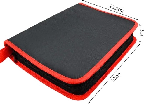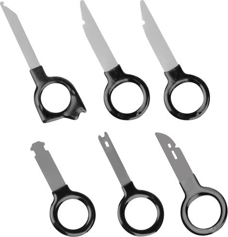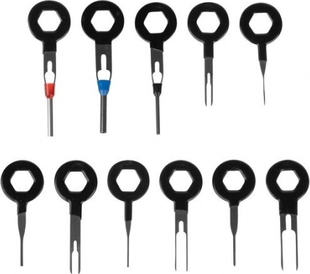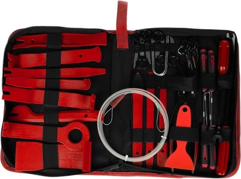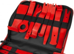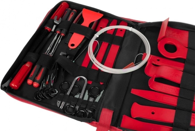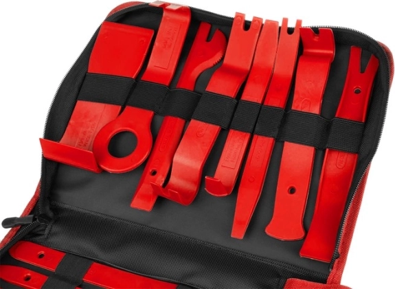 Všetko, čo potrebujete na demontáž interiéru: 12 plastových páčidiel, kliešte na spony, 2 vyťahovače klipov (22,5 a 31 cm), 8 kľúčov na rádio, 11 kľúčov na piny a 4 háčiky. Prehľadne uložené v odolnom puzdre so zipsom.