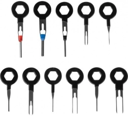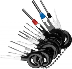 V balení nájdete: puzdro, 12× plastové páčidlo/odstraňovač líšt, kliešte na spony, 2× vyťahovač klipov (22,5 cm a 31 cm), 8× kľúč na demontáž rádia, 11× kľúč na piny, 4× háčik na tesnenie, doplnkový systém na otváranie dverí zvonku.
