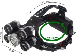 Výkonná čelová baterka s 5 LED CREE T6 diódami ponúka 4 režimy svietenia, nastaviteľný uhol 90° a pohodlný elastický pás. Napájanie zabezpečujú 2 akumulátory 6800 mAh a v balení nechýba sieťová ani autoadaptérová nabíjačka – ideálna na turistiku, cyklistiku, majstrovanie aj núdzové použitie.
