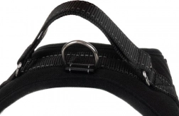 Vďaka pevným prackám a kvalitným materiálom (polyester, bavlnená výplň, nylon, PP, nehrdzavejúca oceľ) je postroj stabilný, odolný a dlhodobo spoľahlivý. Kovový D-krúžok z nehrdzavejúcej ocele slúži na rýchle a bezpečné pripnutie vôdzky. Konštrukcia bez tlaku na hrdlo chráni dýchacie cesty a zvyšuje komfort aj pri dlhších prechádzkach.