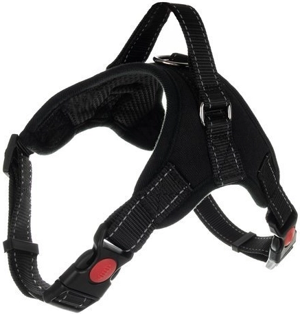 Robustná konštrukcia z polyesteru, nylónu a PP s nerezovými prvkami zaručuje dlhú životnosť. Nastaviteľné pásky umožňujú rýchle a presné dotiahnutie, praktické madlo na chrbte dá extra kontrolu v rušných situáciách a D-krúžok zabezpečí spoľahlivé uchytenie vôdzky.